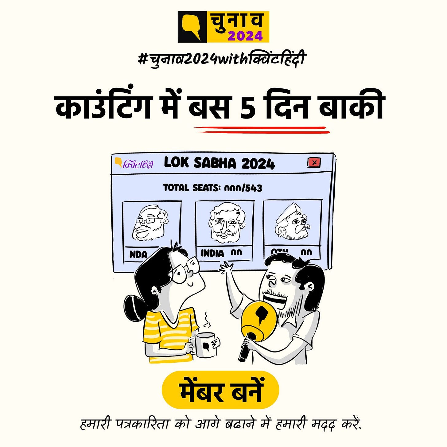 #ElectionResults🗳️ आने में सिर्फ 5 दिन बचे हैं. क्विंट हिंदी आपके लिए अपनी वेबसाइट और सोशल मीडिया पर लाइव नतीजे और विश्लेषण लाने की तैयारी कर रहा है. बने रहें, और हमें सपोर्ट करते रहें. सपोर्ट करें-https://tinyurl.com/bdhcapcj